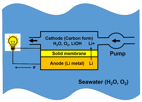 The lithium-seawater battery can deliver over specific energy of 4,000 Wh/kg, which is much greater than that of any electrochemical energy storage systems including hydrogen fuel cells.